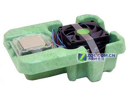 A64处理器内部采用绿色塑料模具加以保护,上部稳妥的固定着处理器包装盒,下部为AVC提供的原装风扇。