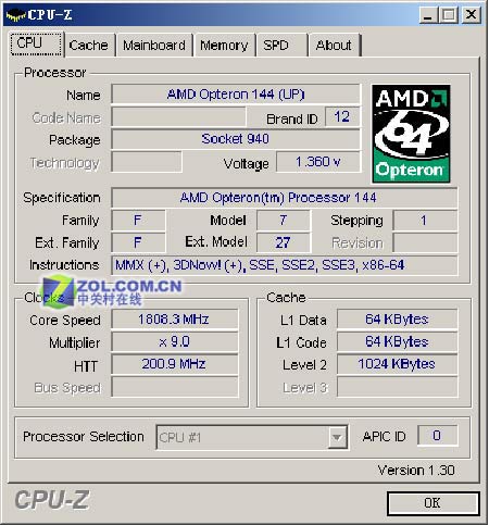 【图】Opteron 144处理器CPU-Z