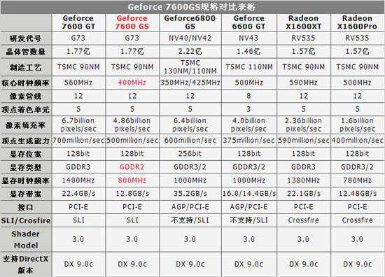 7600GS公版虽然拥有256MB显存容量,但考虑到其参与竞争的是中低端产品市场,因此产品的显存频率不会超过800MHz,核心频率也应该不会超过500MHz。标准的GeForce 7600GS所体现的数据指标应该是采用G73核心,搭配显存位宽128bit、容量256MB、显存芯片类型为DDR2,RAMDAC频率400MHz,同时配备D-Sub、HDTV、DVI-I三种接头类型,支持CineFX 4.0、PureVideo、DirectX 9.0、TurboCache、Shader Model 3.0、HDR等功能,接口类型采用时下流行的PCI-E x16接口,支持SLI技术的新一代显卡。