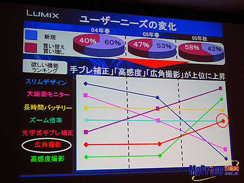 在图中,我们还能看到“三升”,这第一升是指得大家对相机的防抖动性能的需求。早在几年前松下率先在他们的消费级的相机上使用了防抖功能,由于这一功能的运用,大家在拍摄相片时获得了更加清晰的照片,随着松下使用光学防抖技术后,索尼、卡西欧等厂商也纷纷在自己的机器上使用了电子防抖技术,前些时候被索尼收购的柯美使用了镜组防抖技术,防抖技术也是06年的消费级数码相机中必备的元素,就防抖技术本身而言,光学防抖才是最有效的!“第二升”是指得高感光的需求,自2005年富士F10把数码相机带入了ISO 1600年代后,奥林巴斯、卡西欧等厂商纷纷推出了自己的高感光产品,时间到了2006年,似乎ISO 3200将会成为市场主流。提高感光度可以让相机在弱光条件下提供更高的快门速度,避免因为闪光灯对画面质量的破坏。随着松下使用的“维纳斯”引擎后,松下公司在2006年推出的几款消费级数码相机都已经支持了ISO 1600。“第三升”指得是人们对于相机广角方面的需求,由于广焦技术一直受限于镜头的发展技术,早先的广角相机基本都是各厂商的高端旗舰产品,只有一些高价位的相机才使用了广角镜头,而这时大家使用得基本都是28mm的广角,到了05年中后期,已经有越来越多的数码相机厂商在自己的产品上开始使用广焦角镜头,26mm、24mm、23mm,各厂商在不断提升更大的视角。柯达公司在2005年还专门推出了V570双镜头相机,这款镜头在广角镜头上又做出了新的玩法。