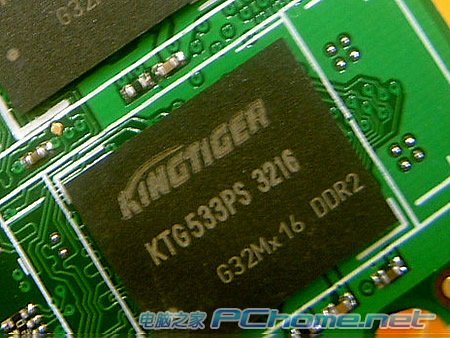 颗粒方面,其采用的是表面标有“KINGTIGER”字样的原厂顶级颗粒,FBGA封装方式,编号为:KTG533PS3216。众所周知,FBGA封装是DDRII官方选择的封装方式,在DDRII时代只有拥有FBGA封装技术的实力雄厚的企业,才能在市场上获得更广泛的认可,金泰克(KingTiger)就是这些优势企业中的一员。