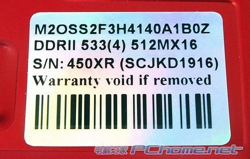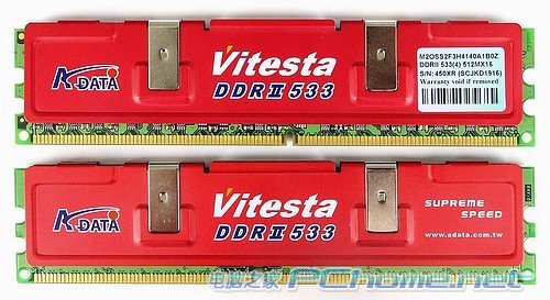 non-ECC unbuffered 240pin 512MB DDR2 SDRAM内存模组,从侧面观察可以发现它们都是双Rank配置,但安装紧密的外壳阻止了我们尝试拆卸它的动作,具体的内存颗粒状况无从知晓。虽然看不到但我们相信威刚的性能!必竟是老厂名牌了,DIYER心里一直是一个很好的形像!