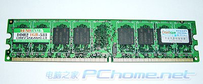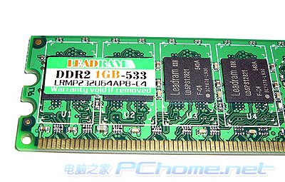 Leadram超胜DDR2-533 512M内存采用清爽的绿色PCB板,内存芯片编号为LD5PS12821 F-C4,默认运行频率266MHz,速度是DDR533 4-4-4-11(CL4);使用60-pin FBGA封装,双面贴片容量为512MB。