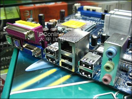 接口提供了标准的6声道音频输出,8个USB接口(预置4个)和内置显卡接口。值得一提的是,这款主板还提供了一条同轴视频输出/S端子视频输出子卡,让内置显卡的多媒体功能如同独立显卡一般丰富。