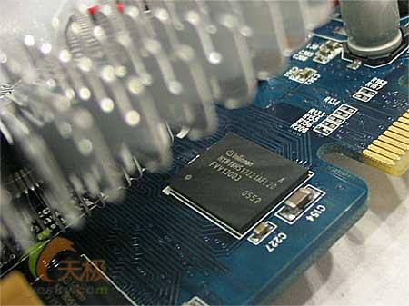 显存颗粒为德国英飞凌2.0ns规格,DDR3 mGBA类别,单面镶嵌8枚,组建出256MB 128bit的空间架构。频率大致为1GHz,低于GT规格的1.4GHz的设定。超频方面颗粒峰值为1.2GHz,动手能力强的玩家,可以尝试下动手能力。