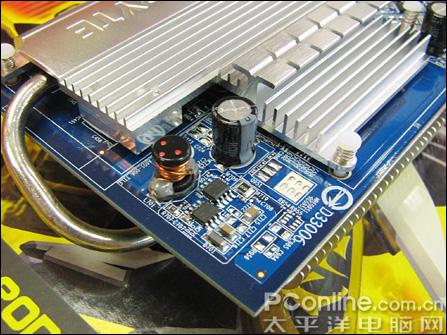 DVI接口一向被人们供奉为当前主流显卡最高品质视频源接口,很多朋友在选择液晶显示器的时候都非常重视。显卡在DVI接口做工相当不错,重点部位采用了钽电容。静音设计是该卡的一大特色,得益于90nm的制程,该卡的发热量可以得到不错的控制。为了加强散热,该卡采用了热管将热量导入到背部的大面积散热片上。