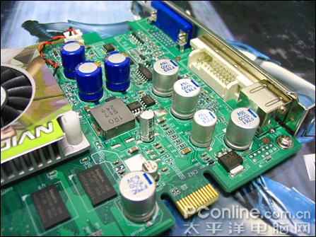 捷波魔力PCX7600GS 豪华版II,整体做工相当扎实,PCB上没有出现只有电容定位框没有电容元件的情况,虽然没有使用常见的豪华日系电容炮阵,不过该卡使用了台系的固态+固态聚合物电容产品,增强了显卡的稳定性。