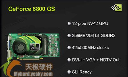 Geforce 6800 GS可以算得上GF6800系列的最后一个版本,也是最具性价比的型号。它也是基于NV42核心,在架构上没有太大的改进,拥有12条渲染管线和5个顶点着色器。NV42最大的改进就是采用了0.11μm制造工艺,成本有进一步的降低,而且在发热和功耗上也有更好的表现,直接表现就是频率更高---核心频率高达425MHz。至于在显存的使用方面,GeForce 6800GS采用256MB/256bit 2.0ns GDDR3显存,频率为500MHz。