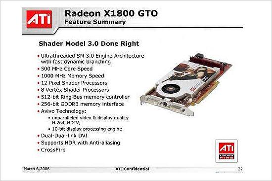 Radeon X1800GTO的上市基本上也ATI的无奈之举。由于Nvidia全新的G73核心在各个方面都完全领先于RV530核心,所以GeForce 7600GT的上市使得Radeon X1600系列在中端市场上倍感压力。而X1800GTO也只好临危受命,担当起了对抗7600GT的使命。