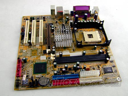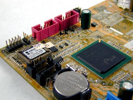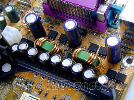 供电模块,虽然采用了两项供电,但是做工毫不含糊,使用了大量名牌高品质电容,对于低功耗的478针CPU来说已经是足够了。并提供了2个IDE以及2个SATA150硬盘接口。