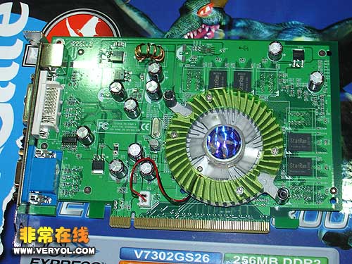 显卡采用256MB 3.0ns starram(星存) GDDR2显存颗粒,默认频率为550MHz/800MHz,相对普通128MB版本的GF7300GS显卡都要更高;大量高品质电解电容密布在显卡表面,为核心和显存提供更稳定、纯净的电流,确保高频率长时间的稳定以及超频使用的可能。