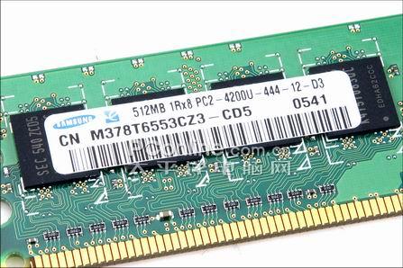 从标签上我们可以看到产地是韩国(这是原厂内存 一个重要依据),容量是512M,采用双面8X2颗粒的架构,速度是PC2 4200U,参数是4-4-4-10,所用颗粒编号是K4T56083QF ZCD5.,标准的DDRII 533颗粒。