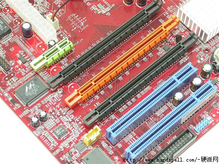 七彩虹三叉戟C.NC19-SLI Pro主板提供了三条PCI Express显卡专用插槽,其中中间的为PCI Express X16插槽,为单独安装PCI-E显卡时使用,而相隔的两个黑色显卡插槽为PCI Express X8,为组建SLI时使用,同时这块主板还提供了一个PCI Express X1和两个PCI插槽。