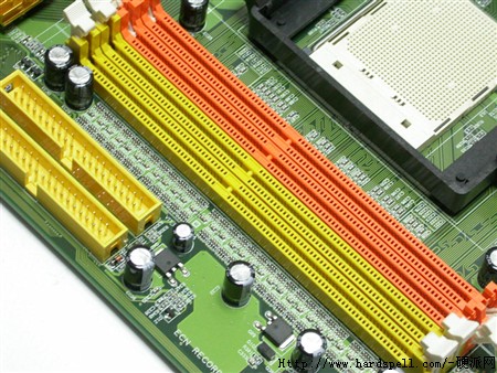 主板板载了4根DIMM插槽,支持双通道DDR400规格的内存,最大支持4GB的内存容量,配合处理器本身集成的内存控制器,可以最大限度的发挥内存的性能。