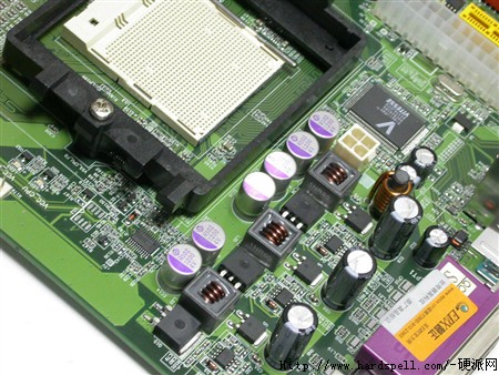 主板供电部分相当强悍,采用3相供电回路设计,全部使用紫色三洋SEP铝壳固态聚合物电容和半屏蔽式扼流线圈组成,不论在设计和做工上都非常精湛。