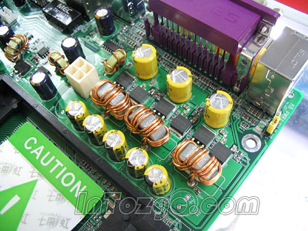 采用三相供电设计,滤波电容采用了口碑不错的富士通R5系列固态电容,品质优良,是主板优异超频能力的重要保证。