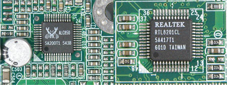 板载ALC850音频芯片,提供7.1声道音频输出,同时还集成RTL8201CL百兆网络芯片。在如此便宜的主板上看到8声道音效芯片,也比较少见。
