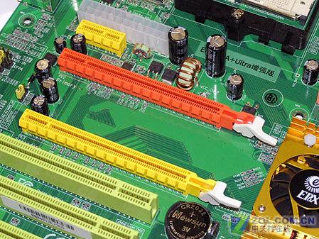 由于主板升级为nForce4 SLI芯片,因此提供2根PCI Express X16插槽,为双显卡模式提供前提。
