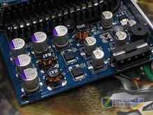 XFX讯景 6800GS AGP版型设计与XFX讯景 6800GS PCI-E有很大的区别。我们知道6800GS PCI-E采用的7800GT版型设计,而XFX讯景 6800GS AGP却使用了完全不同的非公板设计。XFX讯景6800GS采用了蓝色PCB板,8层PCB设计,由此可见这款6800GS显卡的功耗有多高。显卡供电部分采用了大量小贴片电容、三洋固体电容,为显卡的稳定工作提供了保障。