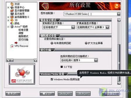 针对HDTV应用,ATi推出了强大的AVIVO技术,并且将该技术应用在ATi Radeon X1000全系列显卡。拥有ATi Radeon X1000系列显卡的用户,只需安装ATi Radeon Catalyst 5.13以上的驱动以及最新的ATI控制中心,即可享受显卡的AVIVO功能。(需要注意的是在安装ATI控制中心之前,要先安装微软的Microsoft .NET 1.1 Framework。)