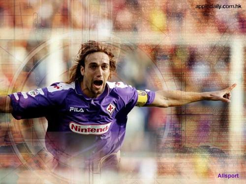 他总是冲锋在最前线,金发飘飘一骑绝尘呼啸夺路;他骁勇善战,用强有力的突破来蹂躏敌人的阵地;他的大力射门、雷霆一击令后卫战栗、令门将胆寒;他是世界上技术最全面的前锋,球场上当之无愧的国王。他就是永远的战神??巴蒂斯图塔。巴蒂让我们敬仰不仅仅是因为他的球技和球场上顽强的作风,我也为他的忠诚所深深地折服,巴蒂的血液里只有两种颜色,一个是阿根廷国家对的蓝白色,还有就是佛罗伦萨的紫色。即使当紫金花降级的时候巴蒂仍然没有离开他的球队他的球迷。虽然巴蒂最后还是离开了,但是他把职业生命中最辉煌的9年全都奉献给了佛罗伦萨,没有人会责怪他,他应该拥有属于自己更高的荣誉。他让足球更有魅力、更具激情、更加爽朗。巴蒂是一颗流星,终将消失在黑暗中,但是他的光芒会深深的留在所有人的心中,永远灿烂!