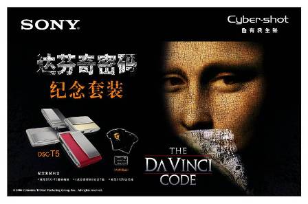 为配合旗下哥伦比亚电影公司斥资1.25亿美元打造的悬疑大片《达芬奇密码》5月19日的全球公映,索尼公司定于5月18日发行Cyber-shot DSC-T5“达芬奇密码纪念套装”,从而使部分消费者能在第一时间感受到《达芬奇密码》的神秘惊喜。这对近期准备购买数码相机的消费者,特别是对悬疑片影迷来说,的确是件一举两得的好事!