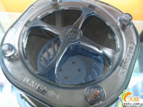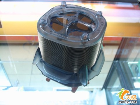 另外在中间热管从铜底向上流经40层柱面的鳍片,均匀而整齐并通过中央的离心风扇产生的高负压吸风区域将冷风快速吸入并对散热鳍片进行冷却。这种散热方式是通过离心风扇吸取散热器的顶部和底部的冷风,并对360度周围的鳍片进行散热。采用这种散热方式可以获得最大的散热面积。