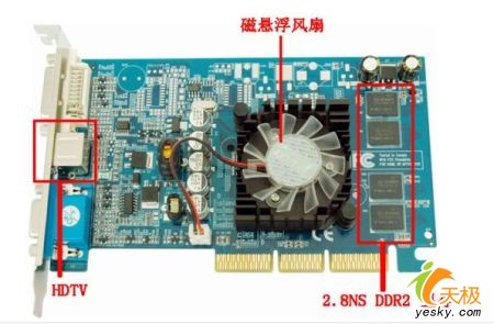 影驰6200A显卡采用蓝色PCB,显卡搭载4颗2.8ns的DDR2显存,128MB/64bit显存规格,默认核心/显存频率为350MHz/700MHz,略强于6200A标版的350/500MHz规格。供电部分,这款显卡用料较讲究,电源部分全部使用高品质元件,还使用了主动式的黑色风扇散热,可有效保证显卡性能的稳定发挥。输出部分,显卡采用全接口设计,具备VGA、DVI和TV-OUT三种接口,方便用户使用。