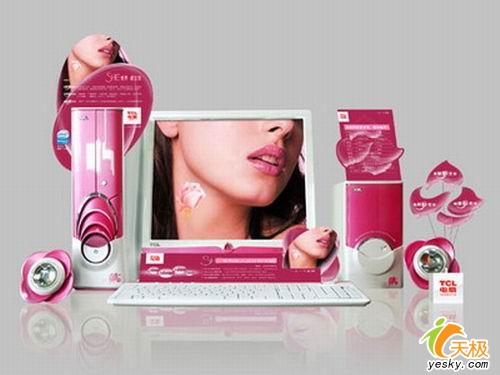 这款TCL SHE 8531可以说设计的相仿精致,其桃花色加珍珠白色泽的主机足以吸引所有人的眼球,侧板两旁设计也比较精美,电源键上拥有方花朵盛开状的纹理,整体设计比较和谐统一,拥有一种独特的女性气质。其性能也不错,拥有Intel P4 516(64位)处理器,主频2.93GHz,搭配256M DDR内存,80G 7200转硬盘,COMBO光驱。集成Intel GMA900显示芯片,17寸润眼液晶显示器,多媒体键盘,光电鼠标和2.1郁金香音箱(花儿般的音箱)。