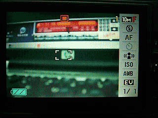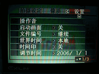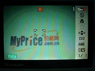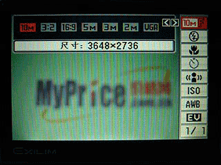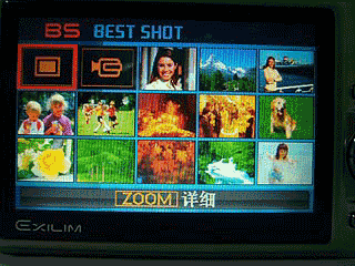 由于采用了宽屏技术,所以菜单位置做了重新的规划,在正常的取景情况下屏幕是按4:3来显示的,右边的突出部分正好是一个快捷菜单列表。下面我们就做了一系列演示动画来显示一下卡西欧Z1000的创新部分。