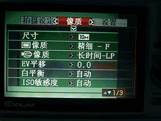 当您按"MENU"键的时候,传统的设置菜单进入了我们的视线,仔细一看主要的一些功能在上面的快截功能上都有体现。机器的高速连拍、闪光连拍以及变焦连拍给小编我留下了深刻的印象。从实际操作来看,这个相机提供了专业级的3张/秒的连拍速度,在用闪光连拍的时候闪光灯在一秒内闪光了3次,很少见到有卡片机有这个能力,不过卡西欧Z1000做到了。而变焦连拍是在拍摄的时候提供一近景和一远景两张照片,不过从实际使用来看,远景应该是相机做数码变焦做出来的,这点意义其实并不大。从整体来看卡西欧Z1000拥有了现在主流卡片相机所有的技术,并且做到了人无我有,人有我精的地步。