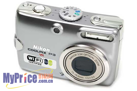 COOLPIX P3并没有在外观上秉承P1和P2的风格,整体感觉比较厚实,而且更圆润可爱,其采用一块尺寸为1/1.8英寸的800万有效像素CCD,能够拍摄最大分辨率为3264X2448的JPG格式图片,还提供了30FPS 100张的超高速连拍功能,不过最引人注意的功能还是提供了IEEE 802.11g/b的WiFi无线传输功能,有效距离达到了30米。