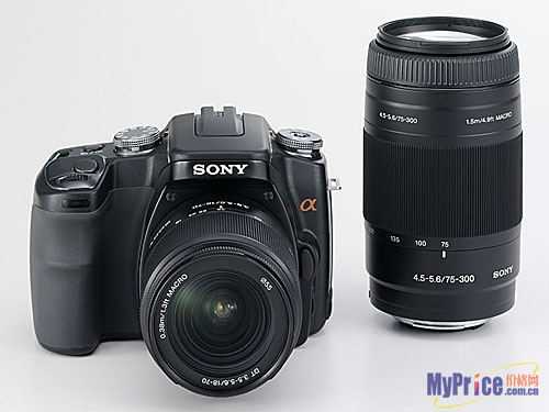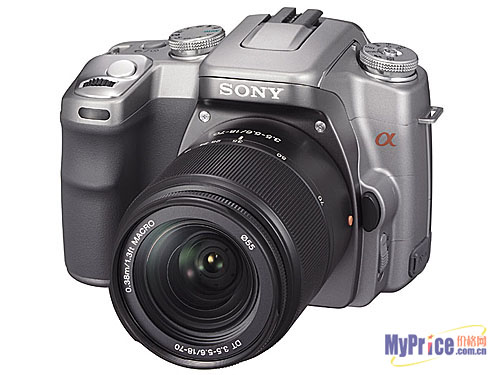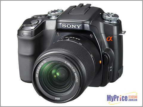 这款数码单反在最终定名的时候还是决定用α做开头,从得到的资料来看,这款产品拥有一颗一千万像素APS画幅的CCD,很显然这个CCD是索尼自行设计并制造的。这也是索尼和柯美在合作后出产的第一款数码单反,从资料来看,这款单反继承了柯美镜组防抖技术,并且在CCD除尘上也有了新的技术进步。