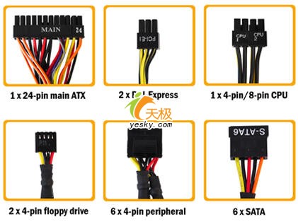 OCZ GameXStream系列电源供应器的ATX主接头为可拆分式20-pin加4-pin设计,无论新旧都可兼容,提供两组支持PCI Express绘图卡的专用6-pin接头,可拆分式4-pin加4-pin CPU电源接头,2组小4-pin软驱电源接头,6组SATA电源接头及6组大4-pin电源接头。