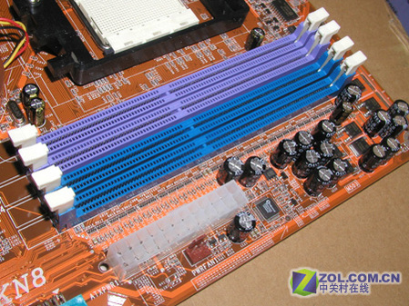 升技KN8主板提供4个DIMM插槽,从图中可以看到内存供电搭配大量滤波电容。