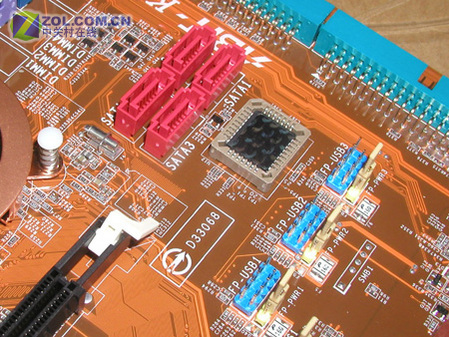 升技KN8主板提供4个SATA接口,支持NV RAID。细节处在USB扩展接口处设计了熔断保险,有效缓解外界电流对主板的损害。