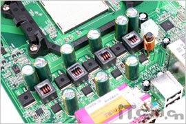 该主板采用扎实的四相供电系统设计,采用了四个卧式半封团线圈和许多来自三洋的3300皮法电容,有效地保证了处理器无论处于正常使用还是在超频状态都能稳定工作。