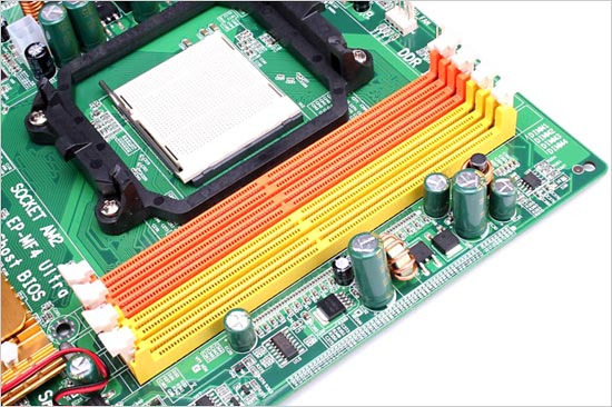 新一代的AM2处理器支持目前主流的DDR2内存,磐正MF4 ULtra主板也提供了四条内存插槽,并且最高支持双通道4GB DDR2-533/667/800。同时,内存插槽的下方也装有2个大容量的三洋电容,3组MOS管控制电压,确保DDR2内存性能得到100%发挥。