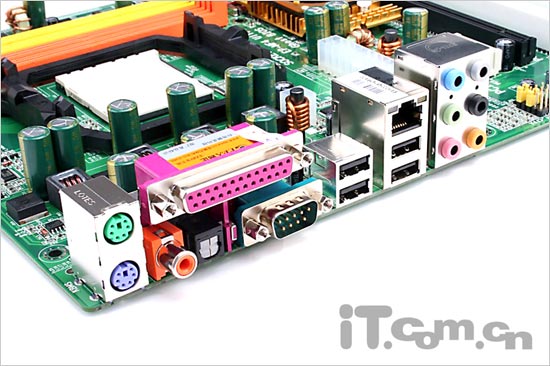 至于主板的扩展面板方面,面板除了提供常见的PS/2接口和LPT接口,还提供了四个USB 2.0接口、千兆网络接口和8声道音频接口。值得一提的是,该产品还提供了同轴输出接口和S/PDIF输出接口,满足了广大音乐爱好者的需求。