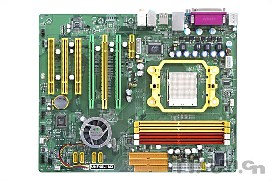 双敏UNF4SLI-M2主板采用了NVIDIA经典的nForce4 4X芯片,支持全系列的AM2处理器。该主板采用采用绿色标准PCB板设计,整体做工和用料充足,布局合理。