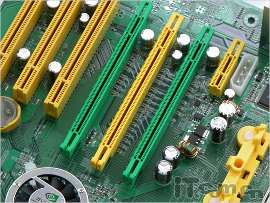 特色的3PCI-E接口得以延续,当使用单卡是,插上黄色插槽,享受PCI-E x16的完整带宽;双卡SLI时插入绿色插槽,体验SLI带来的极速快感,主板会根据显卡自动切换,免除用户跳线设置的麻烦。