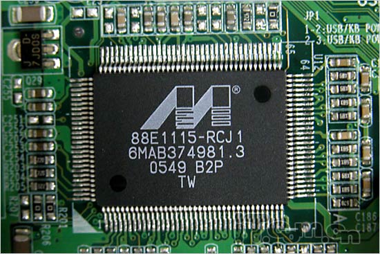 在网络芯片方面,该主板板载了一块88E1115千兆网络控制芯片,提供千兆自适应网络控制。