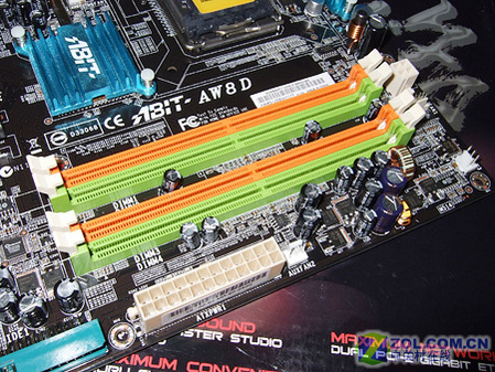 升技AW8D支持双通道DDR2 533/677内存,主板提供4个DIMM插槽。内存供电模块搭配大量红宝石滤波电容。