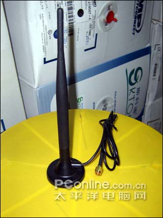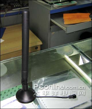 该天线具有8dB的增益,外形呈圆柱型,与一般的立式带延长线天线不同,其顶端和下部是一样的大小,看起来做工还不错,不过从底座延伸出来的连接线比较短,如果是接在PCI无线网卡上,必须有驳接线才能达到较好效果。