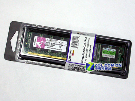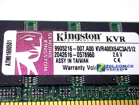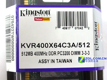 产品封口标签上标注了工频率为容量为512MB,工作频率为DDR400(等效于PC3200),产品型号编号为KVR400X64C3A/512,工作电压为2.6V,时序参数为3-3-3-8。