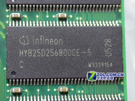 Infineon(英飞凌)CE-5内存颗粒的编号为HYB25D256800CE-5,规格为32M×8bit,总位宽为64bit,颗粒速度为-5NS(等同于DDR400或者PC3200),产品编码“HYB”之后的25代表内存工作电压为2.5V,D代表为DDR内存,末尾数字5代表颗粒速度。