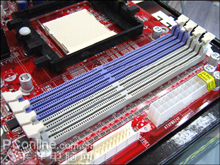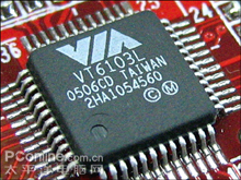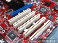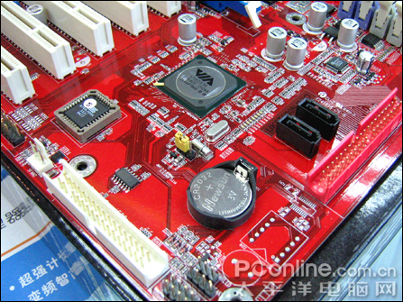 主板南桥附近一览,搭配了8237R的该主板可提供对SATA设备的接口支持,不过对SATA Rev.2.5的兼容性不是太好,如果有计划想购买该产品,注意将硬盘的接口条线设置为SATA 1.5Gb/s模式。