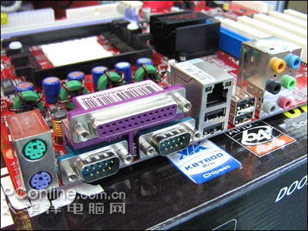 提供了4条2.5v 184-pin DDR DIMM 内存插槽;由于K8T800芯片相对来说规格较旧,因此没有提供PCIe接口。主板板载的是AGP+PCI接口组合。