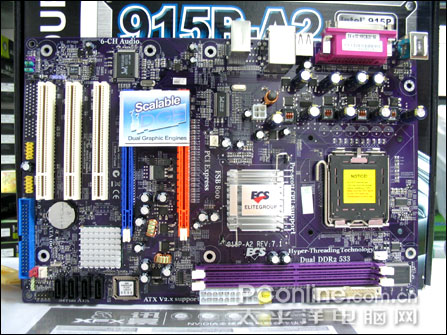 紫色的PCB板延续了精英一贯的风格,915P-A2主板采用Intel 915P+ICH6芯片组,支持LGA775 Intel Pentium 4/Prescott处理器、支持Hyper-Threading 技术、支持800/533 MHz前端总线。主板最大特点是集成两条PCI-E X16插槽,可以支持ATI CrossFire双卡互联技术。