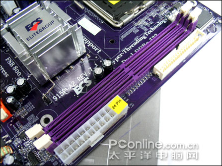 精英915P-A2主板提供两个DDRII内存插槽,支持DDR2 533,支持双通道。旁边的电源接口采用了特殊的双卡榫设计,既可以固定24Pin电源(915平台用),也可以使用普通20Pin接口(老平台使用)。让用户在换平台时,不必扔掉跟随自己多时的电源。